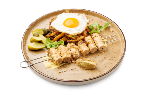 Cârnăciori cu cartofi prăjiți și ochiuri