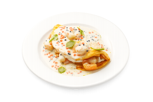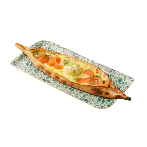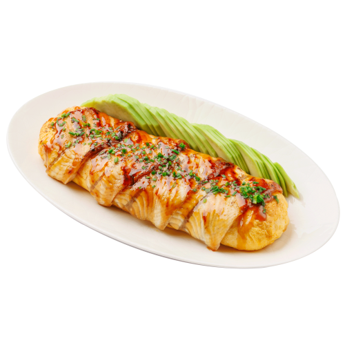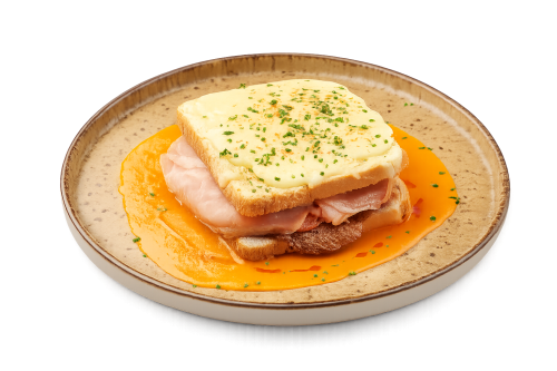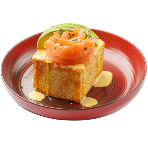 Cub din toast japonez Shokupan cu somon, avocado și oupoșat în interior